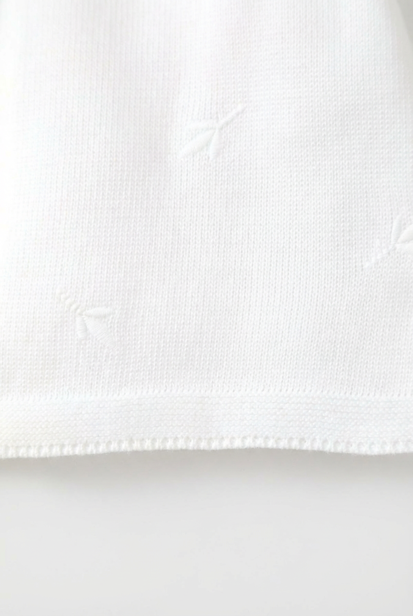 Das Besondere an diesem Modell offenbart sich, wenn das Licht auf die feine Textur fällt. Der Stoff ist nicht einfach glatt, sondern kunstvoll mit einem reliefartigen Muster aus kleinen Blüten und Blättern versehen. Diese haptische Struktur verleiht dem Bolero eine Tiefe und Wertigkeit, die an klassische Handwerkskunst erinnert, ohne dabei aufdringlich zu wirken. Der Farbton – ein reines, warmes Sahneweiß – schmeichelt jedem Teint und harmoniert wunderbar als Jäckchen zum Kommunionkleid oder als Ergänzung zu festlichen Tüllröcken.