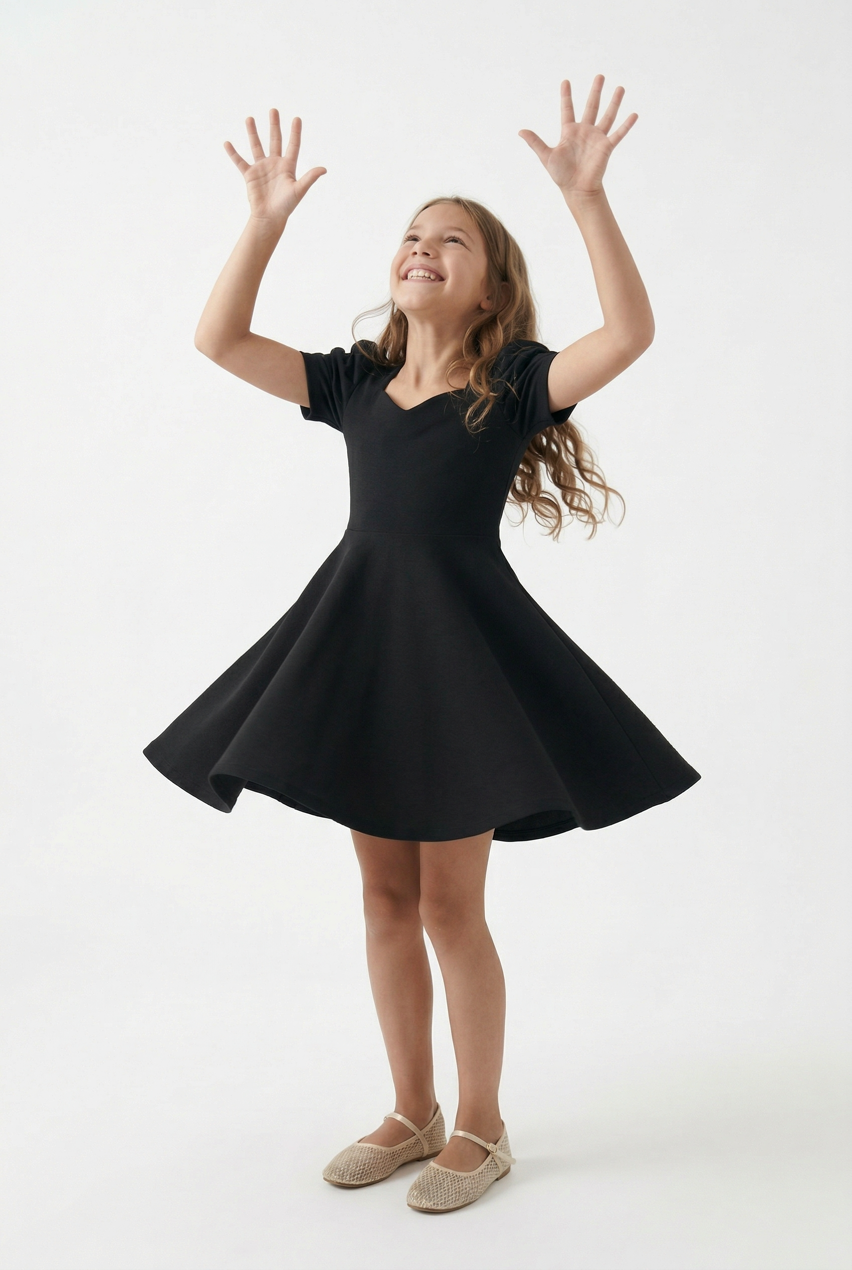 Das Mädchenkleid Vesper in tiefem Schwarz vereint zeitlose Eleganz mit kindgerechtem Komfort. Aus hochwertigem, elastischem Material gefertigt, schmiegt es sich sanft an und lässt Ihrer kleinen Dame volle Bewegungsfreiheit - ob beim feierlichen Anlass oder beim fröhlichen Spielen.